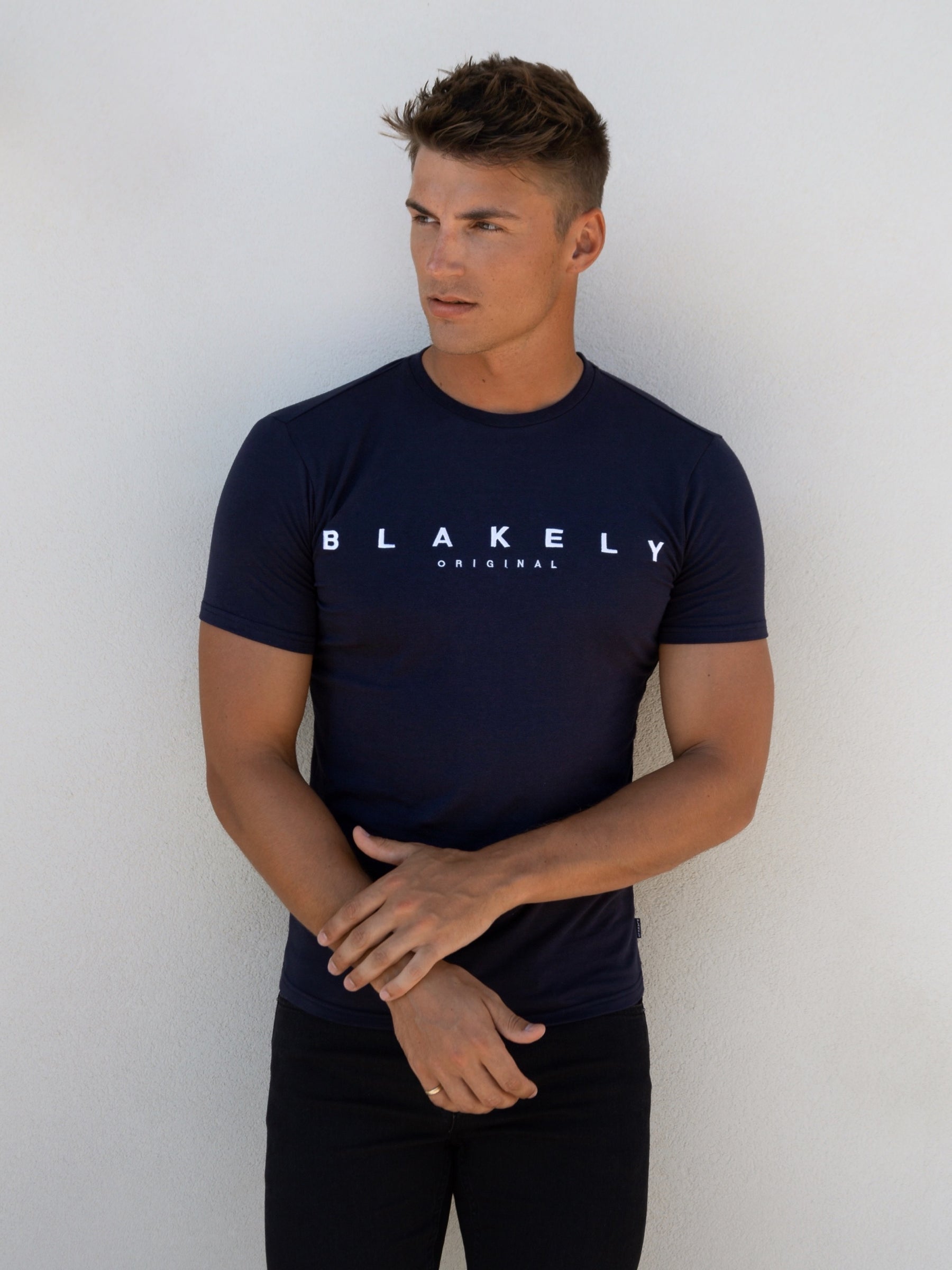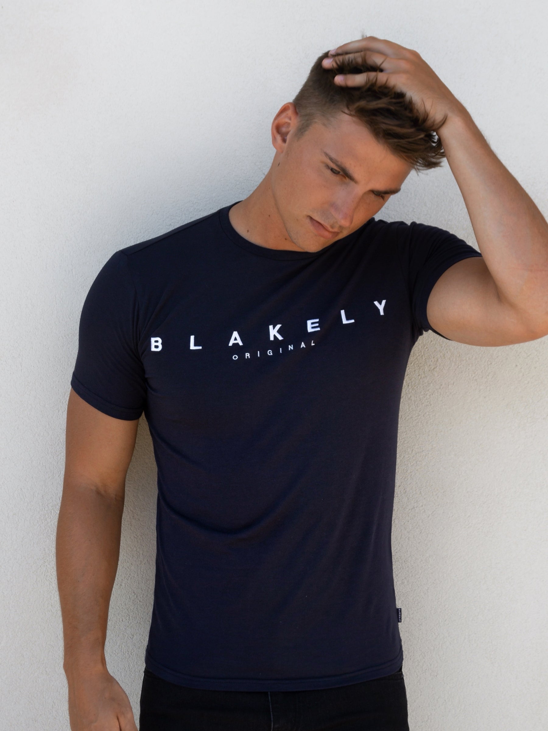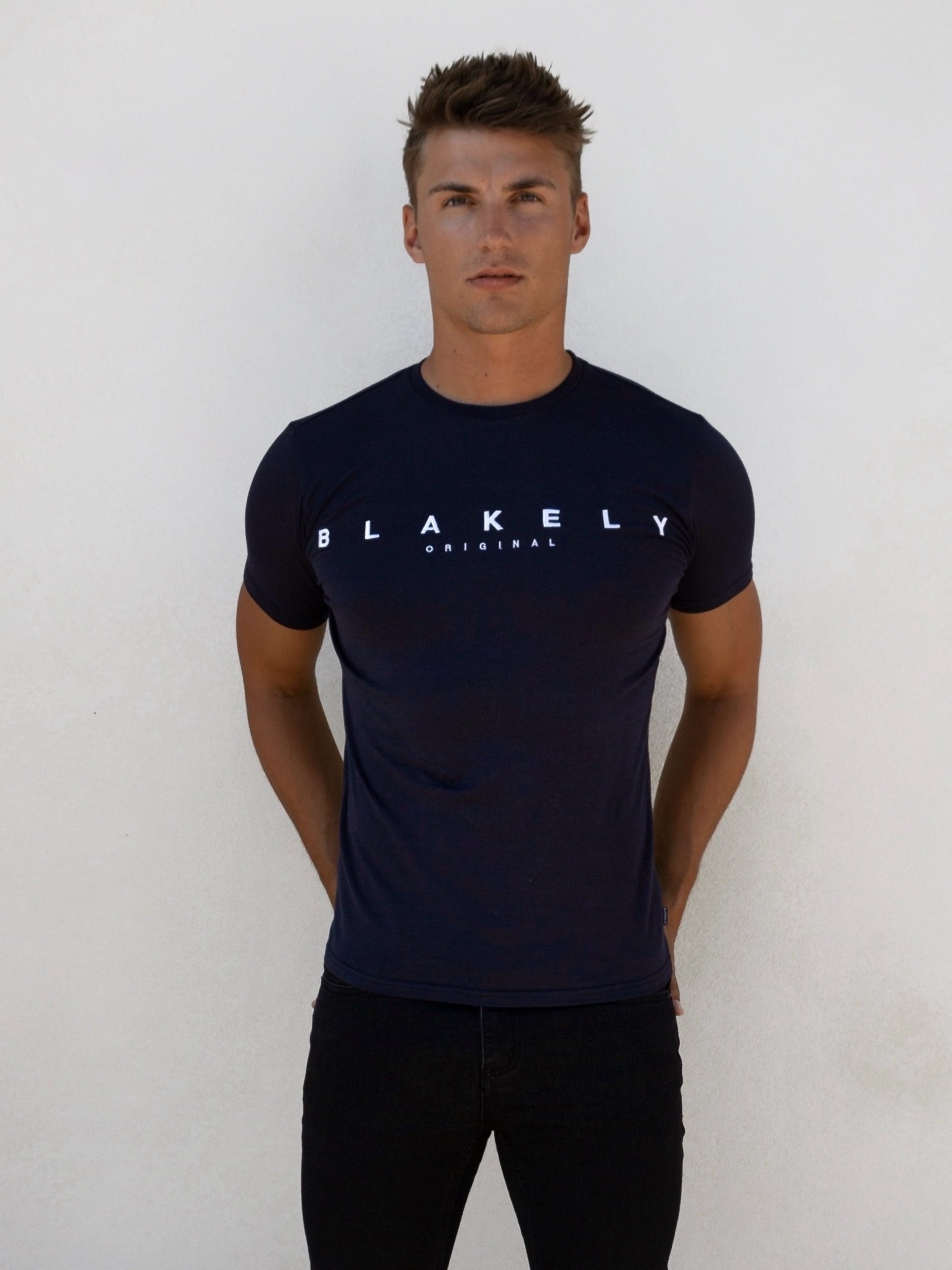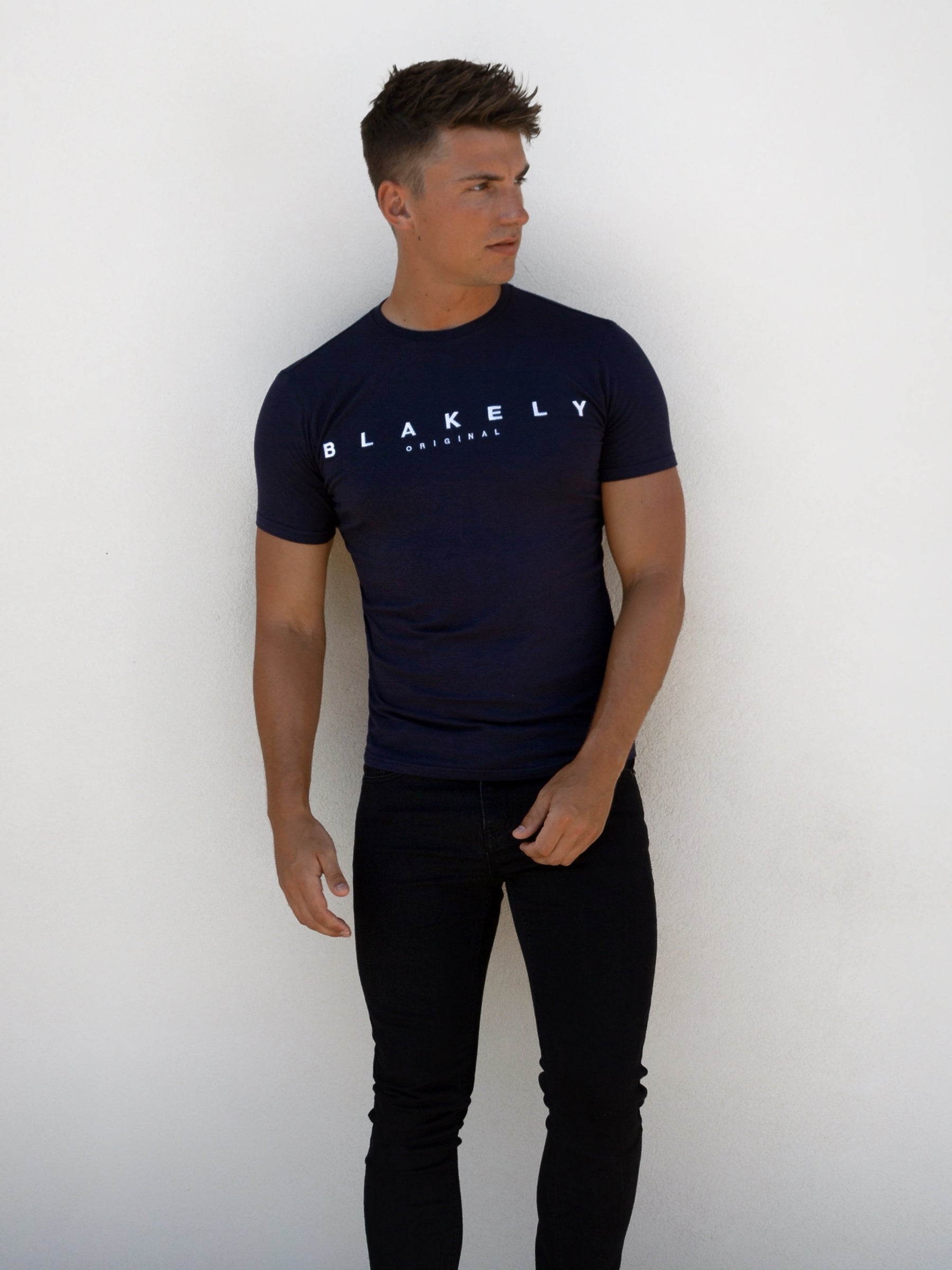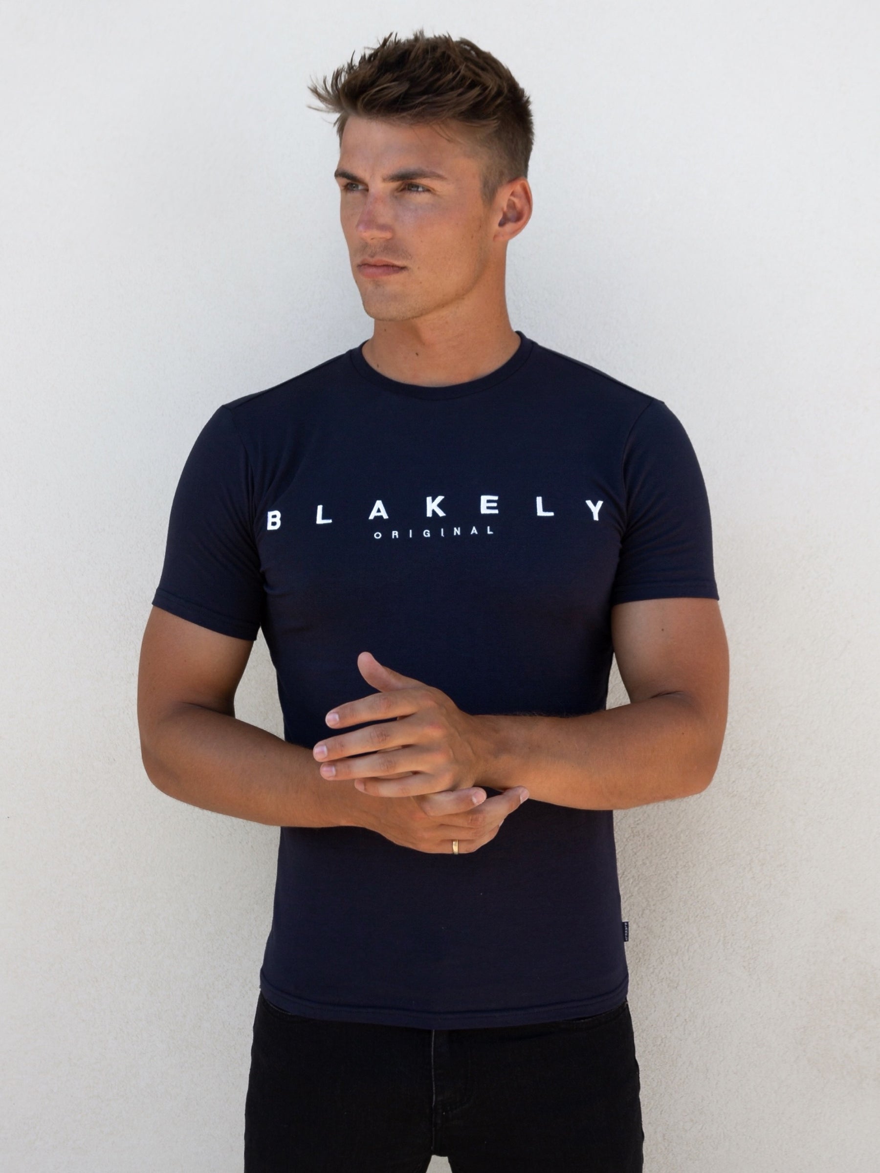 Introducing the Stockbridge T-Shirt in navy, a slim-fit t-shirt made from a soft cotton blend. It has short sleeves, a crewneck collar, and is finished with Blakely branding on the centre front.