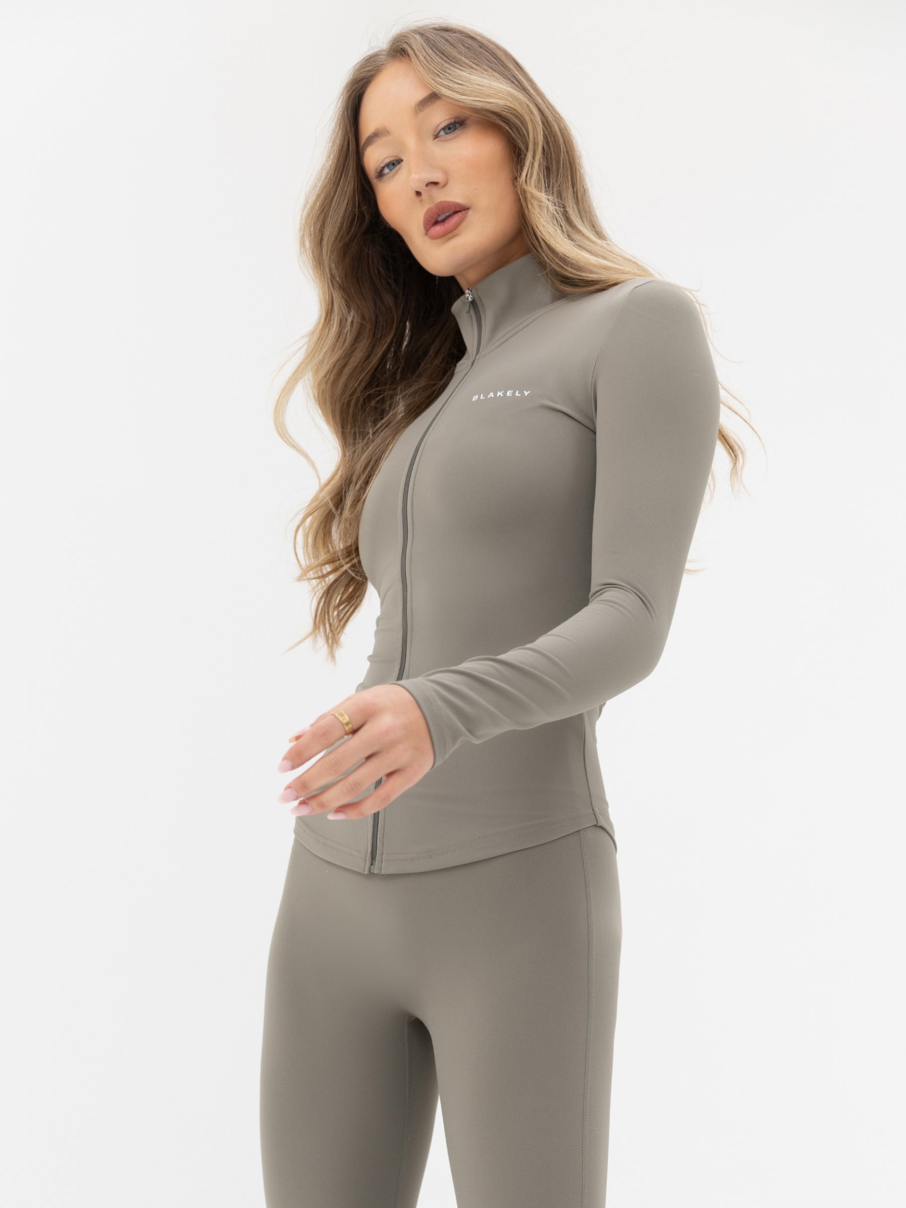 The Ultimate Jacket in Safari Green is crafted from lightweight, four-way stretch fabric. It has a complete zip-up design and long sleeves. The compressive fabric provides ultimate contouring for a perfect fit. It is designed to be worn anywhere, anytime.