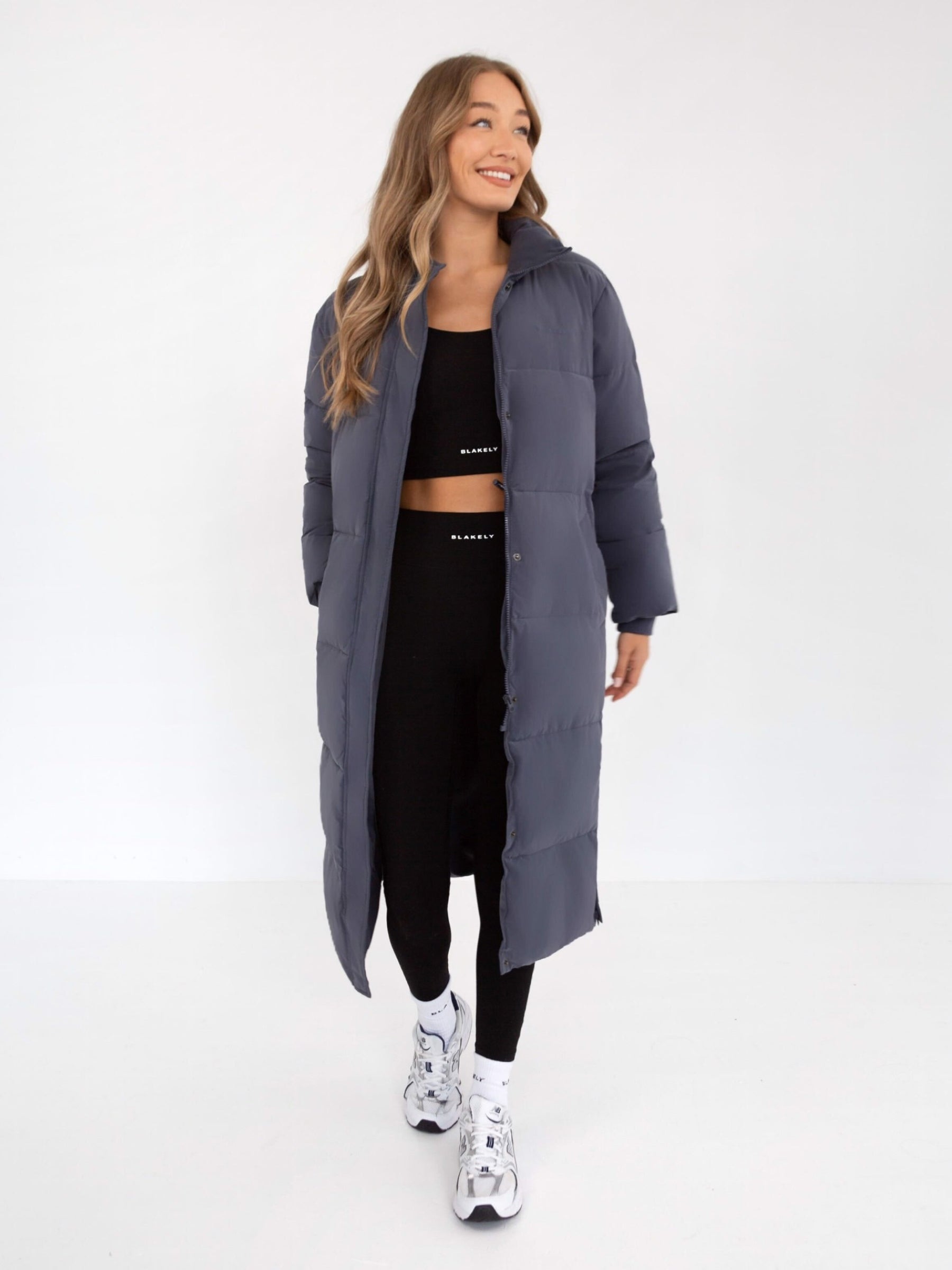Our Ultimate Longline Coat in midnight blue features a clean, tailored design with padded panels running down its length. It falls below the knee and includes side pockets, side vents, and a zip that starts partway up for added movement. The coat is fully lined and finished with Blakely branding on the chest, making it the perfect addition to your winter wardrobe.