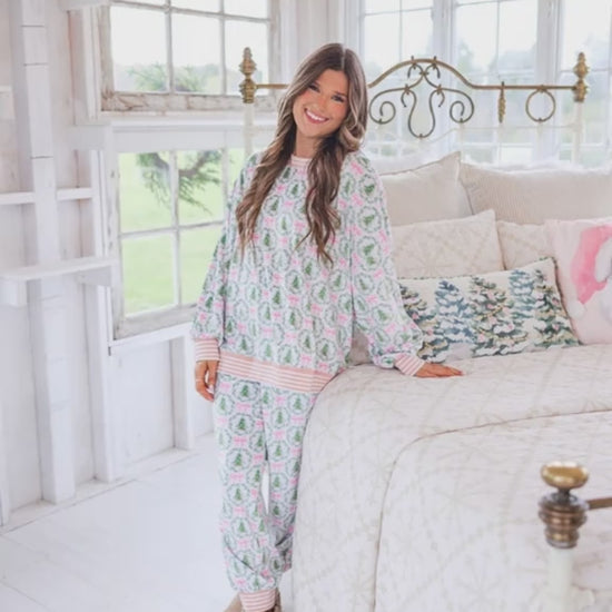 Women’s Christmas Loungewear Set – Tree & Bow Print Two Piece Pajamas | Cozy Long Sleeve Holiday